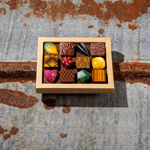 По-малката от средните ни кутии. Дванайсет вкуса, достойно състезаващи се за внимание в небцето. Вкусовете стават по-задълбочени и интригуващи, а пълнежите по-екстравагантни и неочаквани. Новото в сезон 2025/2026 са вкусовете (1) Кестен, (2)Лимонова мащерка и (3) Роза.