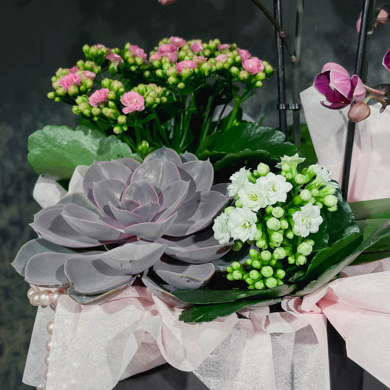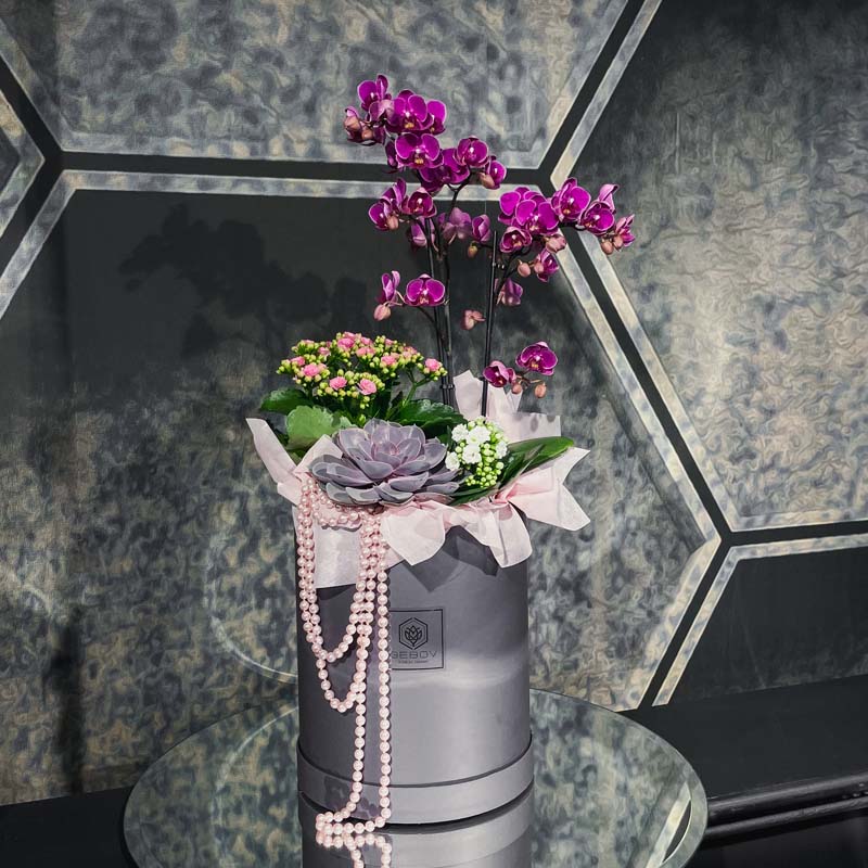 Уникална композиция с естествени растения и орхидея фаленопсис в розово-цикламена гама.